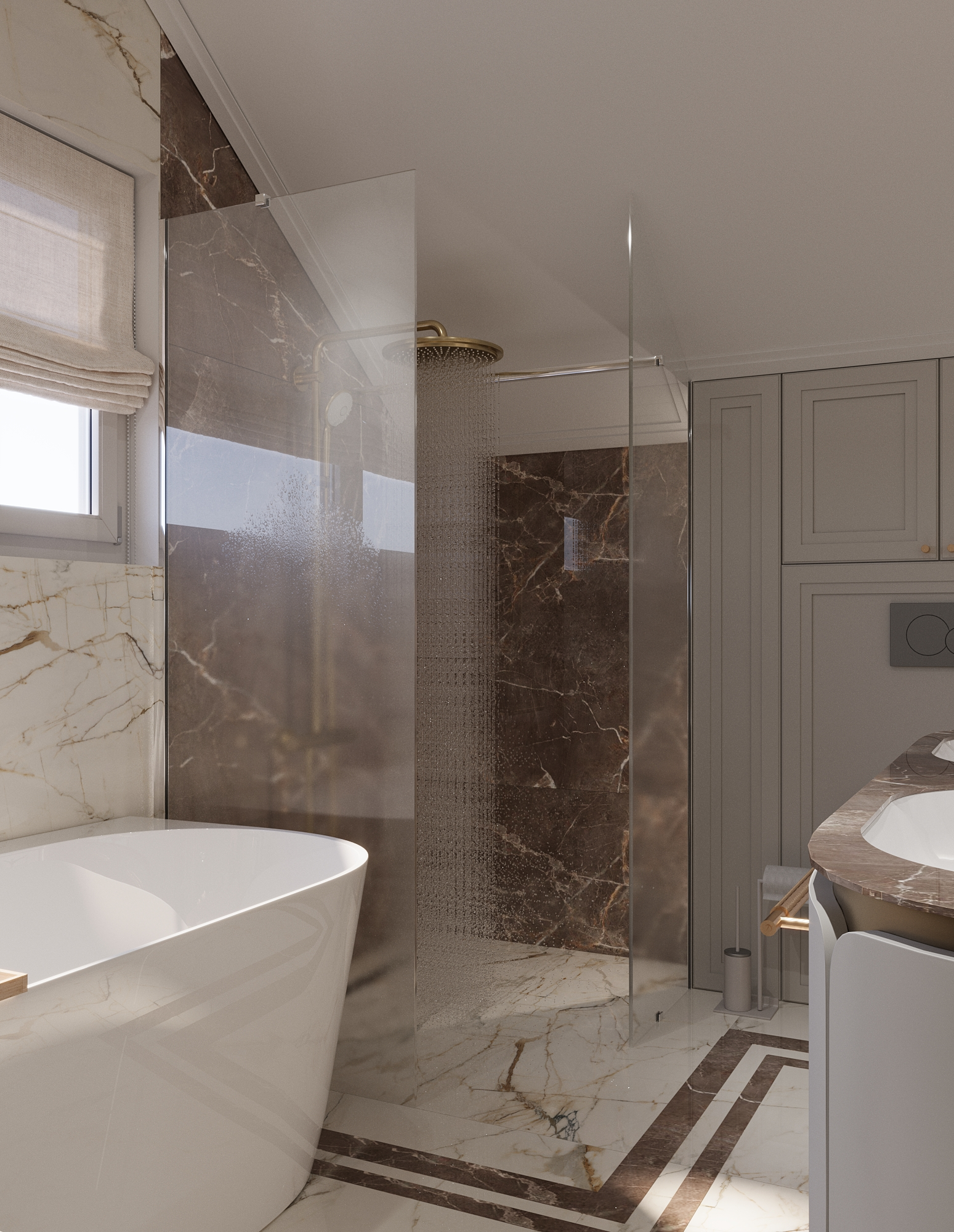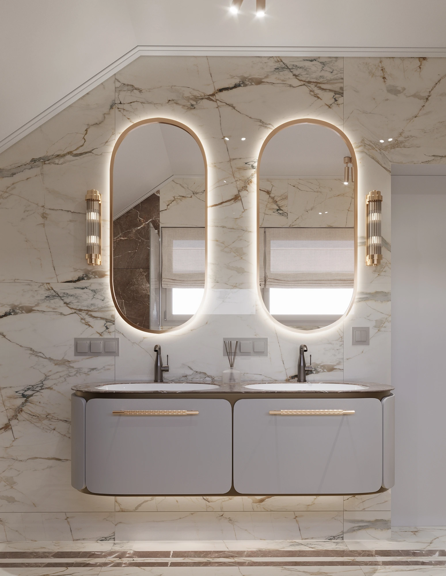 Centralnym punktem aranżacji jest strefa umywalkowa z dwiema umywalkami oraz dużymi, owalnymi lustrami w złotych ramach. Nowoczesne oświetlenie LED podkreśla elegancję projektu i wprowadza nastrojową atmosferę.
