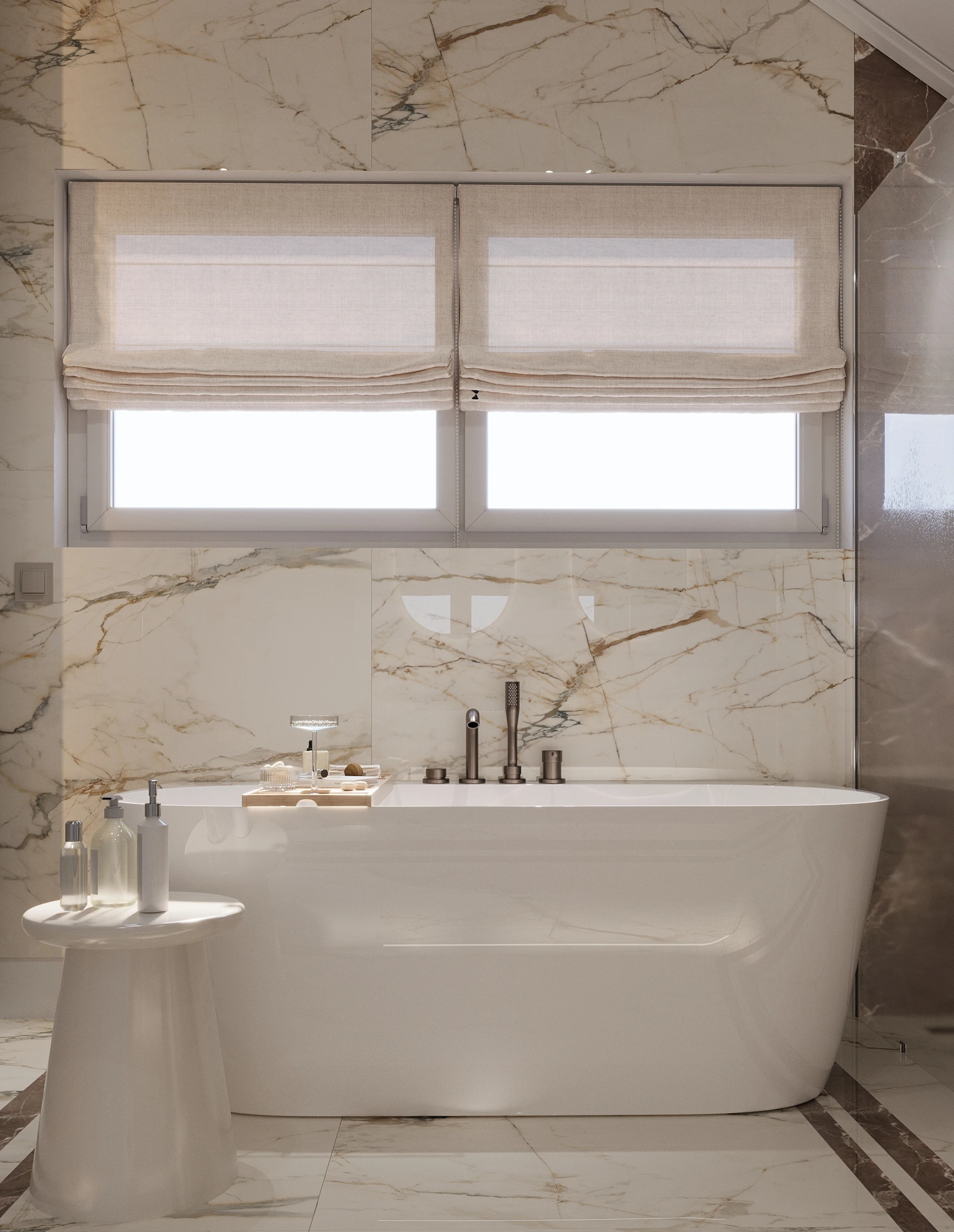 W projekcie znalazła się wolnostojąca wanna, która stanowi serce przestrzeni kąpielowej. Dzięki dużym oknom i odpowiedniemu rozplanowaniu wnętrze jest pełne światła, a jednocześnie pozostaje przytulne i sprzyja relaksowi.