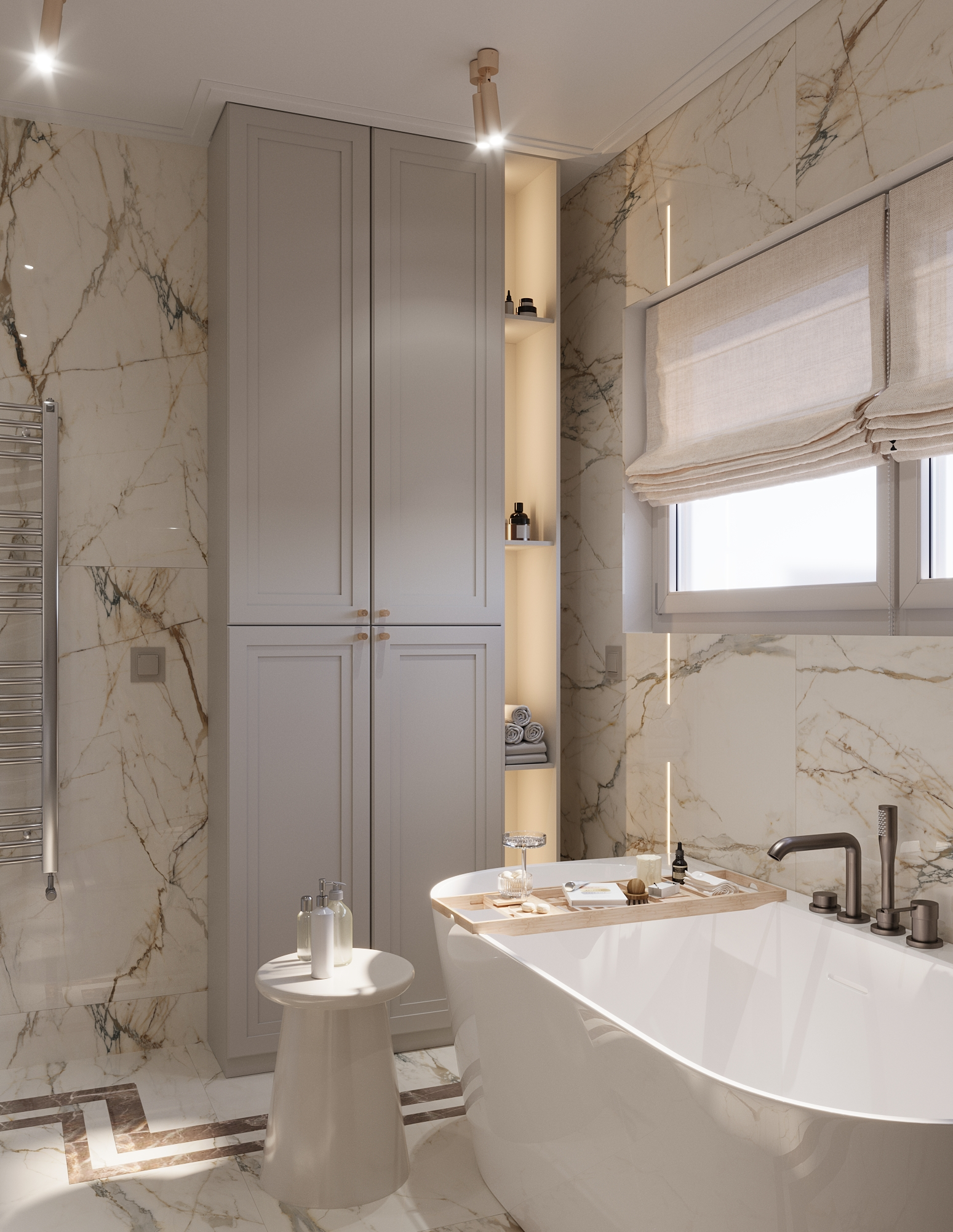 Ten projekt eleganckiej łazienki w Jarosławie to idealne połączenie ponadczasowej estetyki z funkcjonalnością. Dominującym motywem jest gres marmurowy o subtelnym rysunku, który wprowadza do wnętrza aurę luksusu i spokoju.