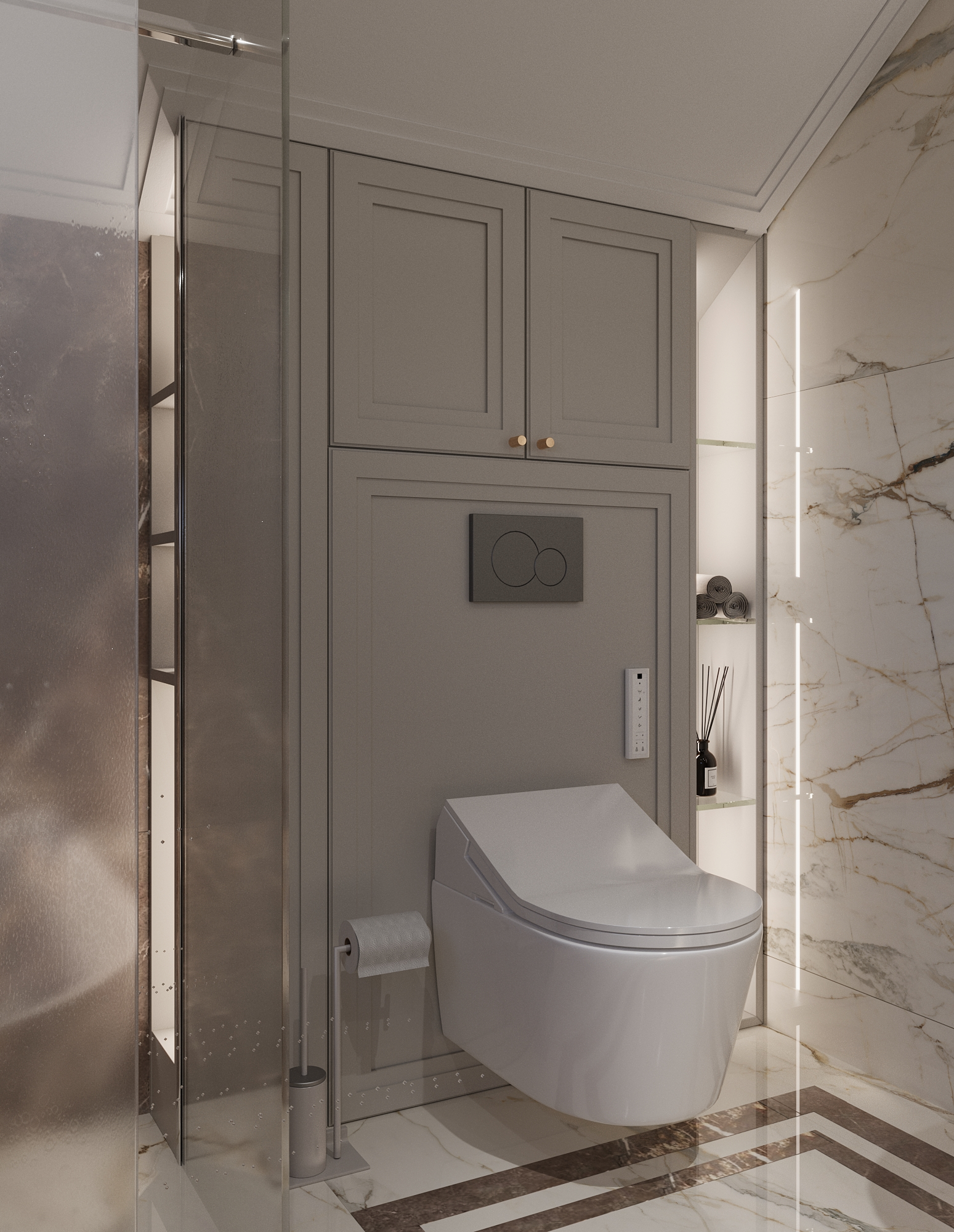 Łazienka została wzbogacona o prysznic walk-in, praktyczne zabudowy stolarskie w odcieniach szarości oraz złote dodatki, które nadają spójności całemu projektowi. Każdy element został zaprojektowany tak, aby wnętrze było jednocześnie piękne i wygodne w codziennym użytkowaniu.